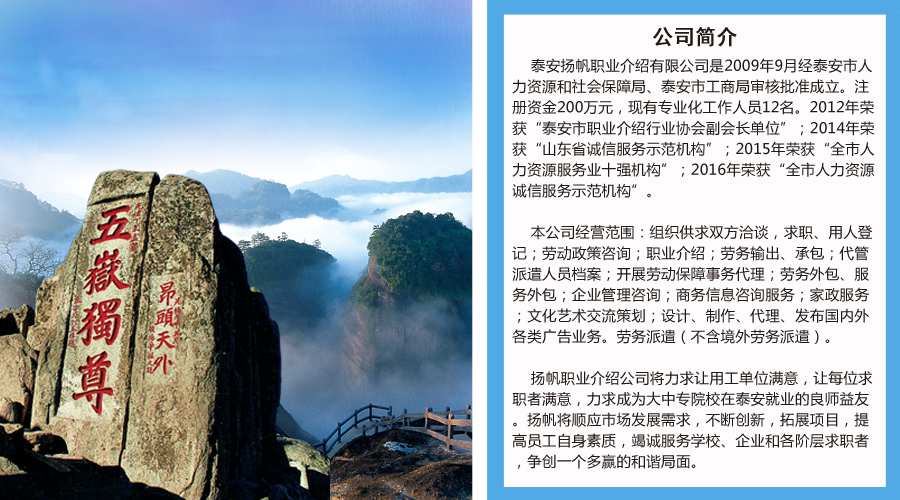 泰安揚(yáng)帆職業(yè)介紹有限公司是2009年9月經(jīng)泰安市人力資源和社會(huì)保障局、泰安市工商局審核批準(zhǔn)成立。注冊(cè)資金200萬(wàn)元,現(xiàn)有專業(yè)化工作人員12名。2012年榮獲“泰安市職業(yè)介紹行業(yè)協(xié)會(huì)副會(huì)長(zhǎng)單位”;2014年榮獲“山東省誠(chéng)信服務(wù)示范機(jī)構(gòu)”;2015年榮獲“全市人力資源服務(wù)業(yè)十強(qiáng)機(jī)構(gòu)”;2016年榮獲“全市人力資源誠(chéng)信服務(wù)示范機(jī)構(gòu)”。